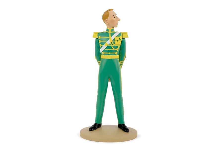 Figura del creador de Tintín, Hergé, vestido de oficial Syldavo, tal como aparece en el Palacio de Klow durante la recepción real en en el álbum El cetro de Ottokar (lámina 38, viñeta D1).